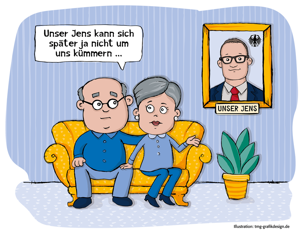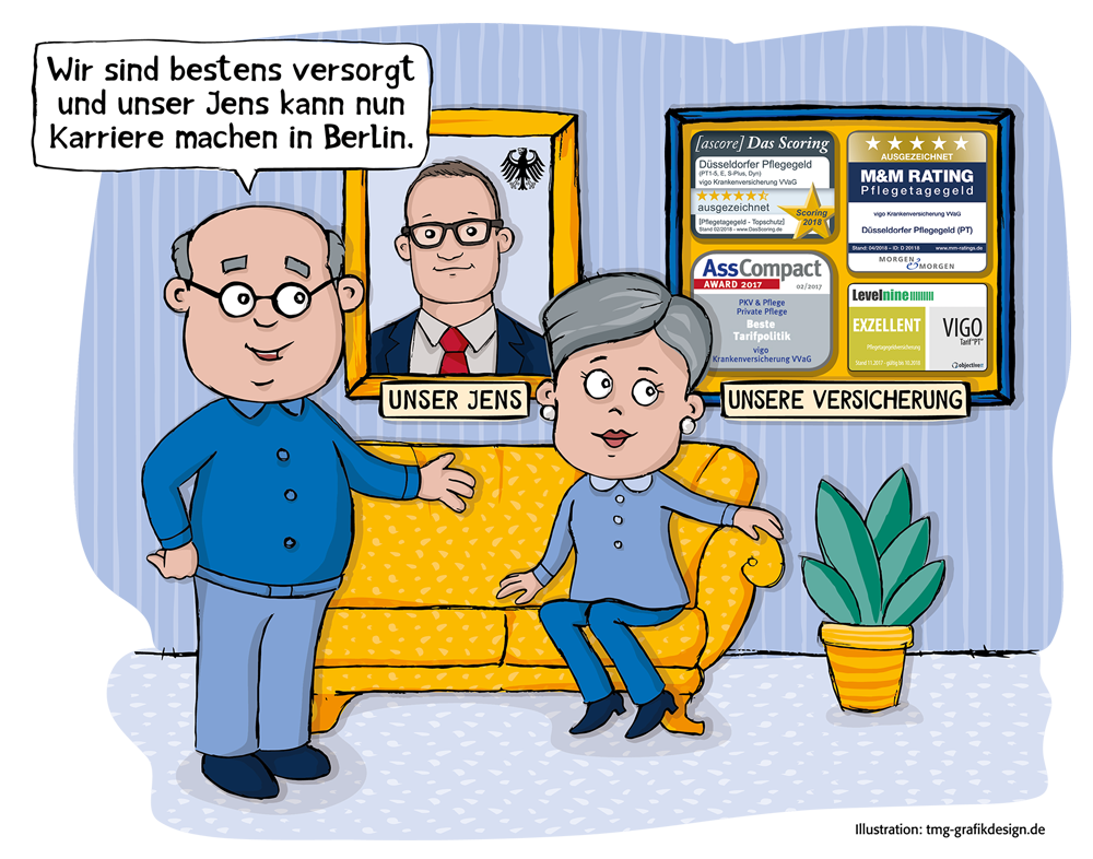 Bundesgesundheitsminister Jens Spahn äußerte bei „Maischberger“, dass er sich nicht vorstellen könne, seine Eltern zu Hause zu pflegen. Sie würden von ihm aber ohnehin nicht erwarten, wegen ihnen Abstriche zu machen. Eine für viele Bürger verständliche Sichtweise – trifft sie die Situation ja in gleichem Maße. Nur können sich Otto-Normal-Bürger hinsichtlich der Finanzierung dieses Modells weniger sicher sein. Spahn trat zudem zuletzt mit umstrittenen Äußerungen über Menschen mit geringem Einkommen in Erscheinung. In Kombination beider Themen sieht die vigo eine Steilvorlage für eine karikaturistische Werbekampagne und richtet sich dabei an unabhängige Versicherungsvermittler als Multiplikator und Bindeglied zum Kunden.